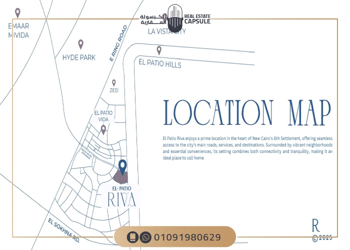 يأتي موقع كمبوند باتو ريفا التجمع السادس ليؤكد على استراتيجية لافيستا في اختيار المواقع المميزة لمشروعاتها حيث يقع الكمبوند بجوار مشروع مراكز ” كمبوند كريسنت ووك ” وعلى الطريق الدائري الأوسطي مباشرةً في قلب القاهرة الجديدة بالتجمع السادس وهو أحد أكثر المناطق الواعدة التي تشهد طفرة عمرانية كبرى خلال الفترة الأخيرة، والذي يعكس رؤية لافيستا في توفير تجربة سكنية تجمع بين الهدوء والخصوصية داخل مجمع سكني متكامل وبين القرب والسهولة في الوصول إلى جميع الخدمات المجاورة وهذا بفضل اقتراب El Patio Riva من جميع الطرق والمحاور الرئيسية بذلك يصبح باتيو ريفا الخيار الأمثل للراغبين في الجمع بين رفاهية السكن وموقع استراتيجي يضمن قيمة استثمارية عالية.