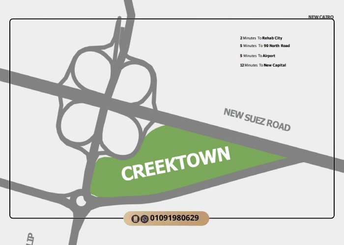 Creek Town Compound New Cairo occupies a prime strategic location in the First Settlement, directly on Suez Road, making it one of the Fifth Settlement’s most notable projects. Specifically situated at the entrance to Rehab City, the development enjoys proximity to essential services, facilities, and vital roads that residents frequent daily.