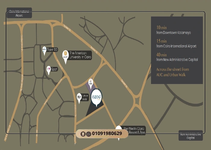 يقع كمبوند أزاد التجمع الخامس مباشرة أمام بوابة 3 للجامعة الأمريكية بالقاهرة (AUC) على شارع AUC الرئيسي، وهو من أكثر الشوارع الحيوية في قلب التجمع الخامس