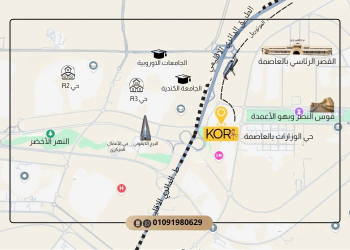 يمتاز مشروع kor new capital بموقع استراتيجي استثنائي بين الحي المالي ومدينة الثقافة والفنون وهو موقع يجمع بين الحيوية والتميز ويضع المشروع في قلب منطقة الأعمال والترفيه بالعاصمة كما يتميز التصميم المعماري للمول بتخطيط عصري يجمع بين الأناقة والوظيفية، حيث يضم 7 مباني ما يتيح تنوع كبير في المساحات لتناسب جميع احتياجات المستثمرين ورواد الأعمال كما أن المشروع يتم بالشراكة مع وزارة النقل وجهات حكومية، ما يمنحه مصداقية عالية ويعزز ثقة العملاء في جدية التنفيذ واستقرار العائد الاستثماري.