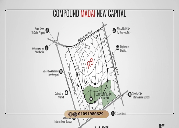 في قلب واحدة من أكثر المناطق تطورا في العاصمة الإدارية الجديدة نطلق لكم كمبوند ماداي العاصمة الادارية Madai New Capital تجربة سكنية تم تصميمها بعناية لتمنحك معنى مختلف للراحة والجودة، اخترنا موقعنا داخلالحي الثامن R8 – القطعة C2 لأننا نؤمن أن السكن لا يكتمل بدون مكان يحترم وقتك و يسهل حياتك ويضعك بالقرب من أهم المحاور والخدمات الحيوية، نحن لا نقدم مجرد وحدات بل مجتمع متكامل يمنحك خصوصية و قيمة واستثمار آمن يتضاعف مع الوقت.