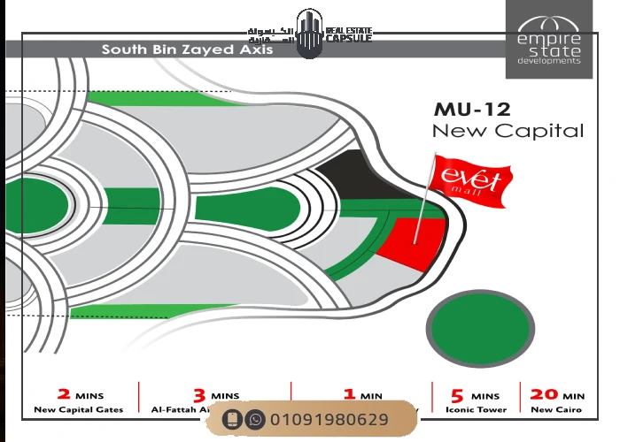 اختارت الشركة المطورة لمشروع مول ايفيت العاصمة الإدارية الجديدة موقع استراتيجي بعناية داخل واحدة من أكثر مناطق العاصمة الإدارية حيوية ونمو بحيث يضمن حركة يومية مستمرة تخدم النشاط التجاري على المدى القريب والبعيد حيث يقع المول في MU12 على محور رئيسي مباشر مع بنية تحتية مكتملة وشوارع ممهدة ما يمنحه وضوح عالي وسهولة وصول من مختلف الاتجاهات دون تعقيد.