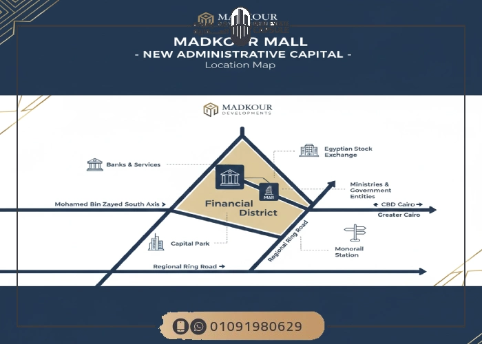 اختيار هذا الموقع لم يأتي بالصدفة فقد حرصت شركة مدكور على وضع المشروع في منطقة حيوية تضم أهم المؤسسات المالية والخدمية ما يسهل الوصول إليها ويضمن سيولة ونشاط دائم داخل المول.