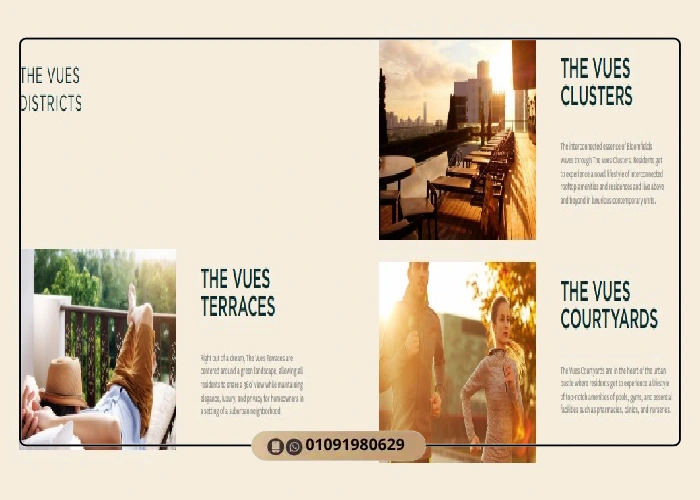 مرحلة ذا فيوز the vues: تمتد هذه المرحلة علي مساحة 10 فدان وتضم مجموعة متنوعة من الوحدات السكنية ( فلل _ تاون هاوس _شقق فاخرة )