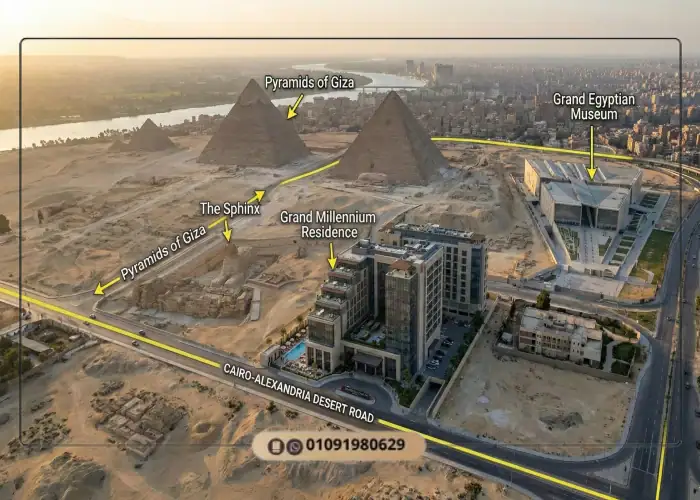 وقد اخترنا أن يكون مشروعنا في قلب واحدة من أعظم مناطق الجذب السياحي في العالم بإطلالة مباشرة وصريحة على أهرامات الجيزة وعلى بعد دقائق معدودة من المتحف المصري الكبير لنمنح الملاك تجربة فريدة وفرصة استثمارية مصحوبة بطلب سياحي دائم ومتزايد ولم نكتفي بالموقع وحده بل حرصنا على التعاون مع علامة فندقية عالمية مرموقة مثل Grand Millennium لتتولى إدارة الشقق الفندقية بأعلى معايير الخدمة والجودة