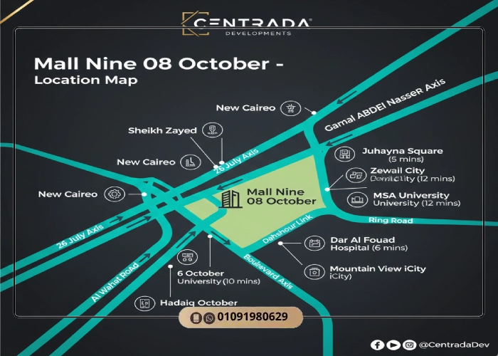مول ناين 08 اكتوبر Mall Nine 08 October هو أقوى مشروع تجاري يمكنك أن تستثمر فيه وذلك لأنه يوفر لك كل عناصر النجاح في مكان واحد، كما أنك تتعامل مع مشروع تجاري وإداري وطبي ضخم تم تخطيطه ليصبح أكبر مجمع على محور البوليفارد وبموقع استراتيجي مباشر بالقرب من وصلة دهشور مما يضمن حركة مستمرة وطلب دائم على الخدمات والأنشطة داخل المول.