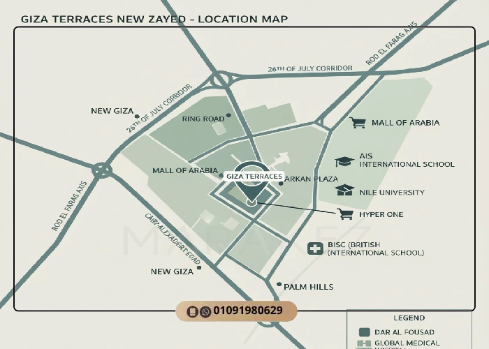 اختارت شركة مراكز للتطوير العقاري موقع كمبوند جيزة تيراسيز زايد الجديدة بعناية فائقة ليكون في قلب واحدة من أكثر المناطق تميز في غرب القاهرة وتحديدا في التوسعات الشرقية لمحور الشيخ زايد أمام مشروع نيو جيزة وبجوار هضبة بالم هيلز، هذا الموقع الاستراتيجي لم يكن اختيار عشوائي بل جاء نتيجة دراسة دقيقة لحركة النمو العمراني والبنية التحتية الحديثة التي تشهدها زايد الجديدة، والتي أصبحت الوجهة الأولى للمشروعات السكنية الفاخرة في مصر.